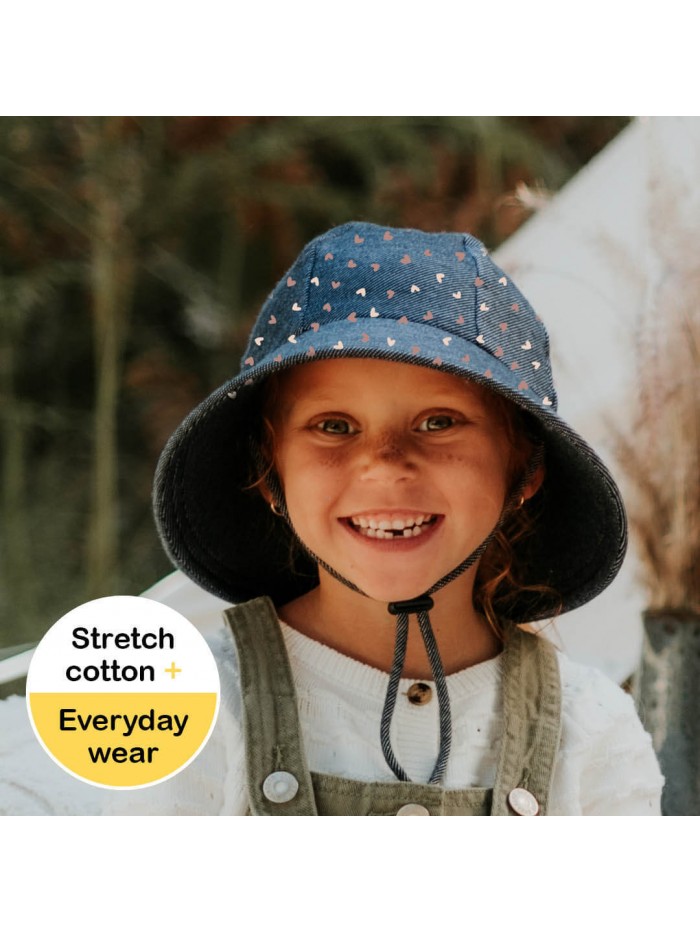 Sweethears for your sweetie. These soft pink and peach hearts are sprinkled over our denim base hat for a classic fave with a twist. Sweetie print is available in Legionniare, Toddler Bucket and Ponytail Bucket.